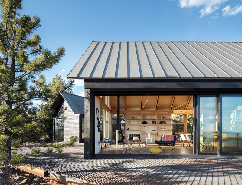 The “Big Cabin” accommodates the master bedroom, living and dining areas, kitchen, pantry, gym/sauna and a bathroom. An extra bedroom, with a bathroom for guests, is located just nearby, in the sister cottage, connected to the larger cabin through steel decking.