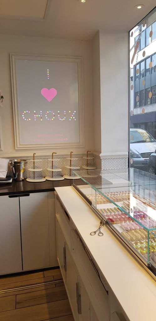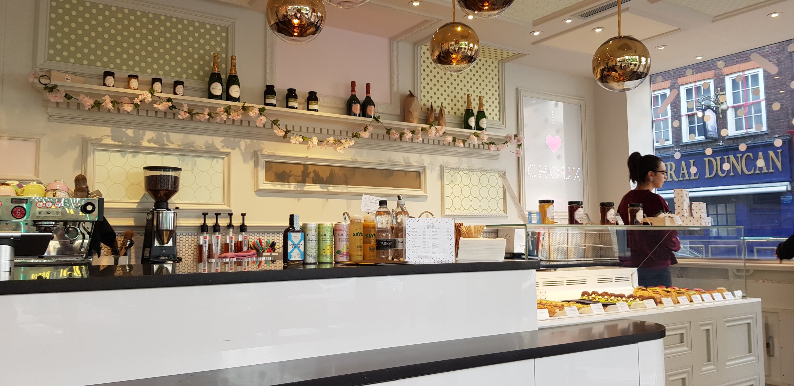 Sophisticated patisserie featuring a variety of gourmet pastries & gift boxes in a posh interior.