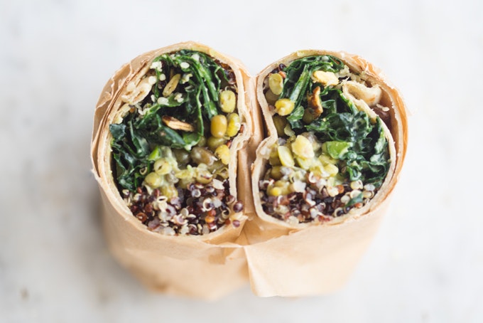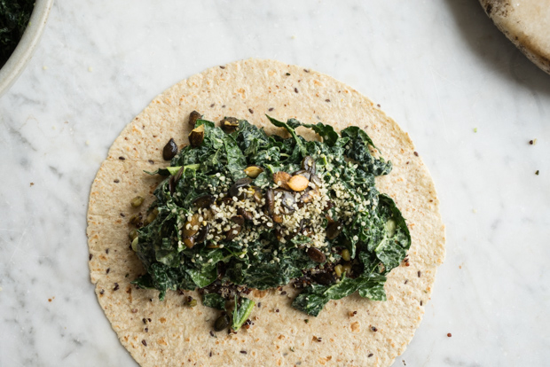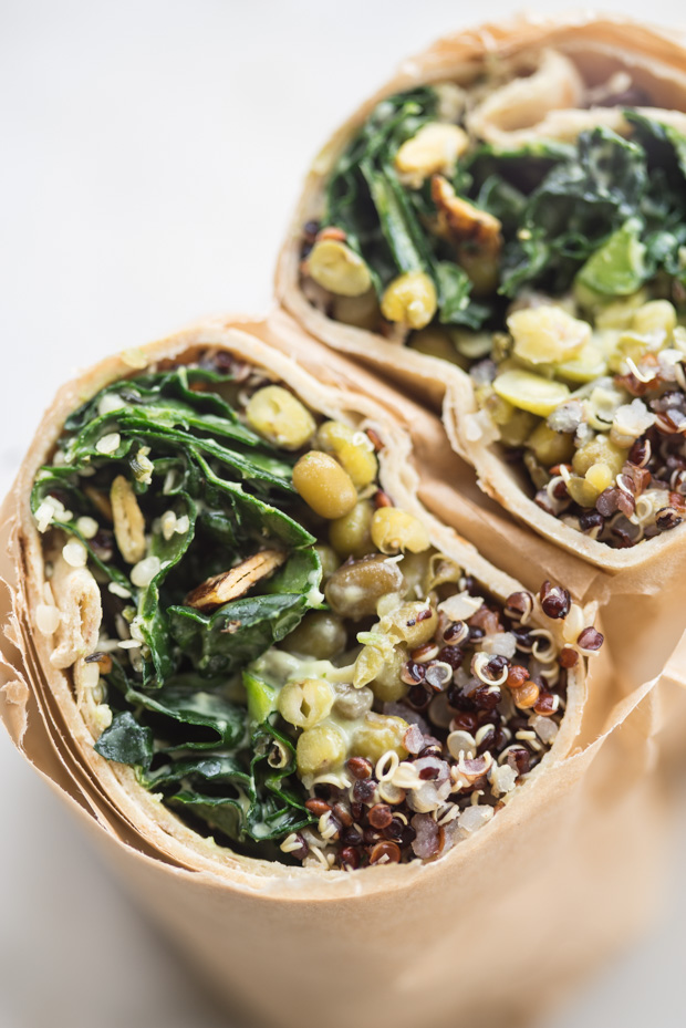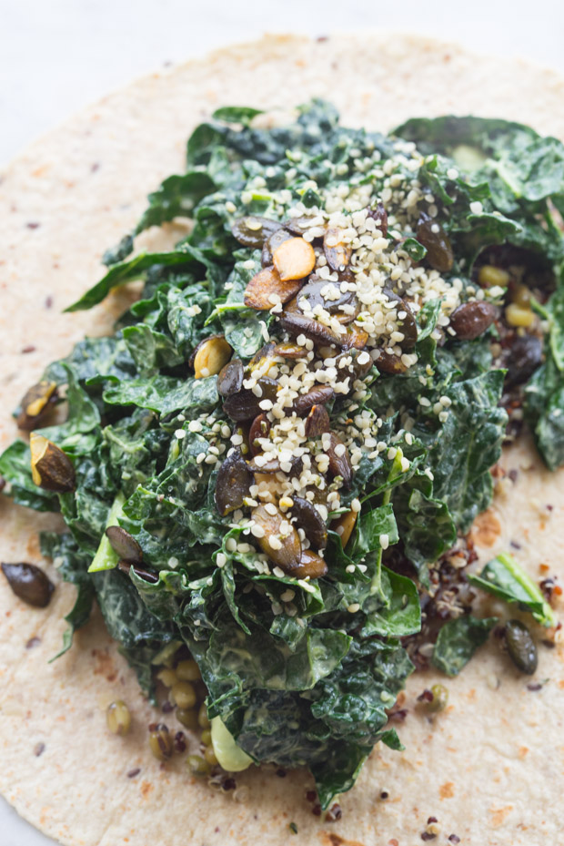 - Place one tortilla on the counter and fill with about 1/2 cup of the quinoa, 1/2 cup of the mung beans, a couple generous dollops of the dressing, a handful of the kale mixture, and a sprinkling of pepitas and hemp seeds (if using). Fold and roll, and then repeat with the remaining burritos. Wrap each in parchment paper, and then foil if you’re planning on eating later. You can freeze in multiples, wrapped in parchment, and then foil in large plastic bag.