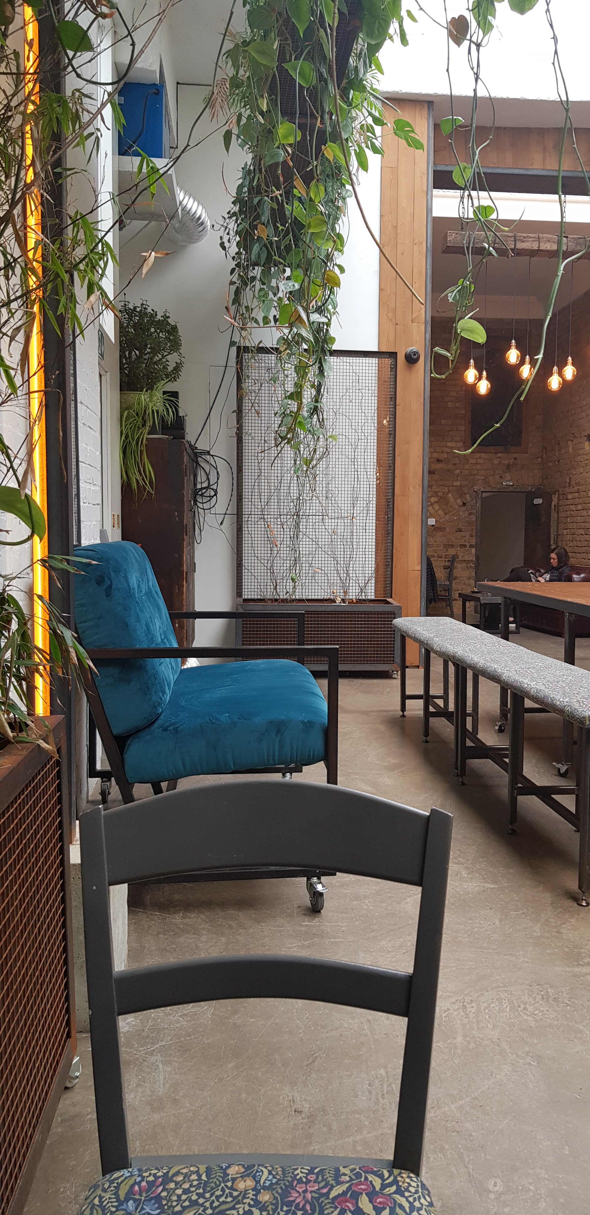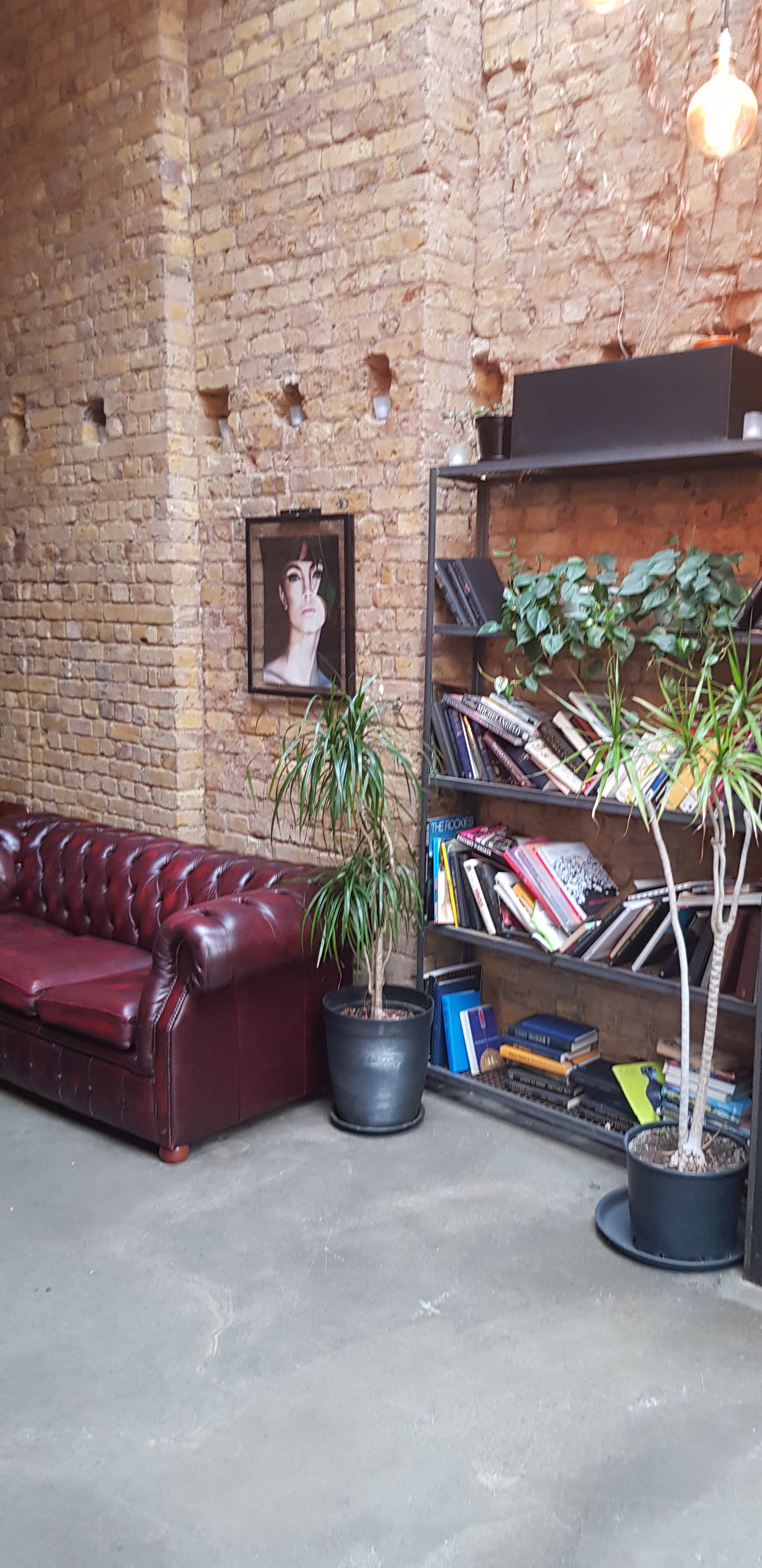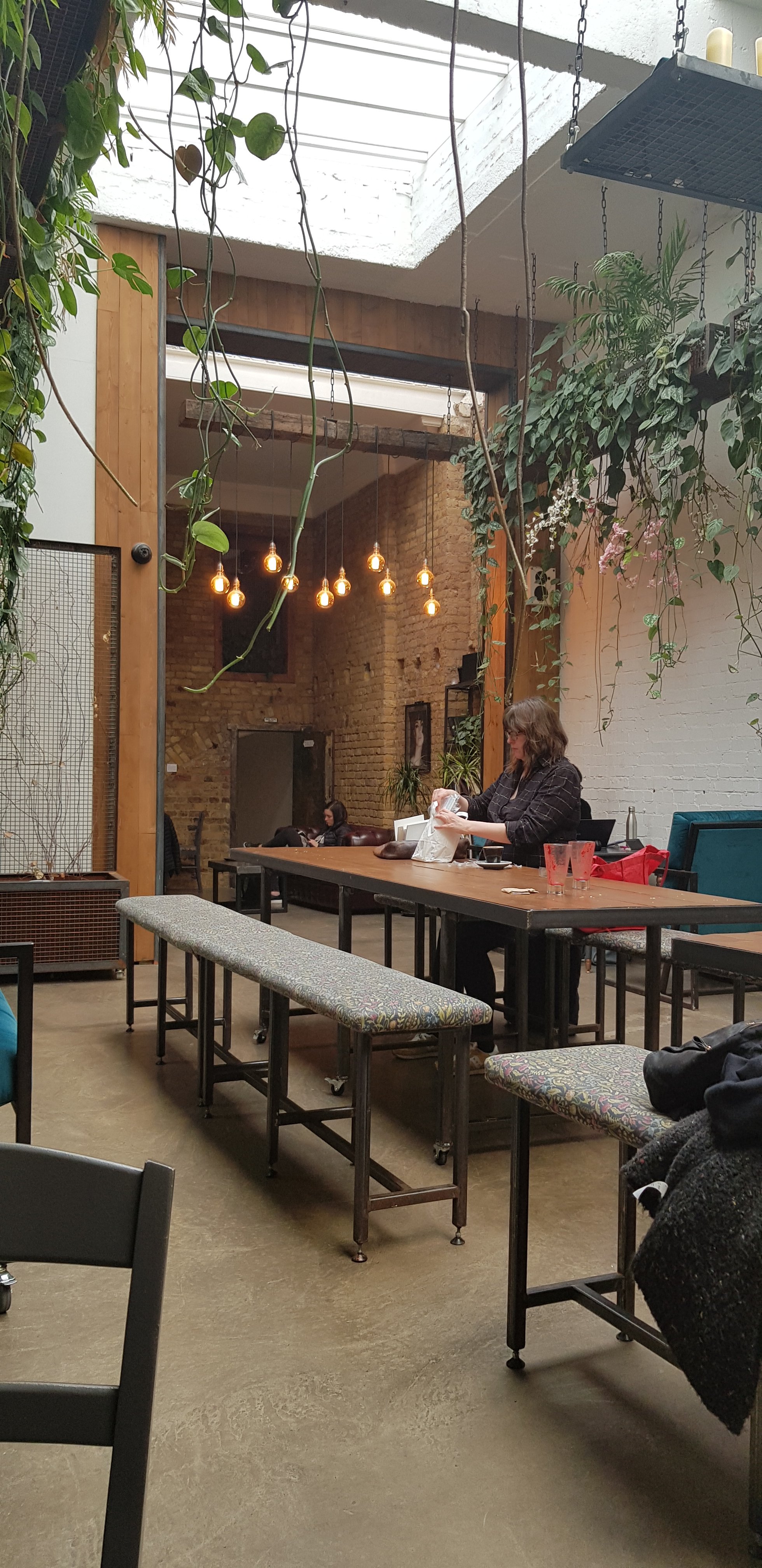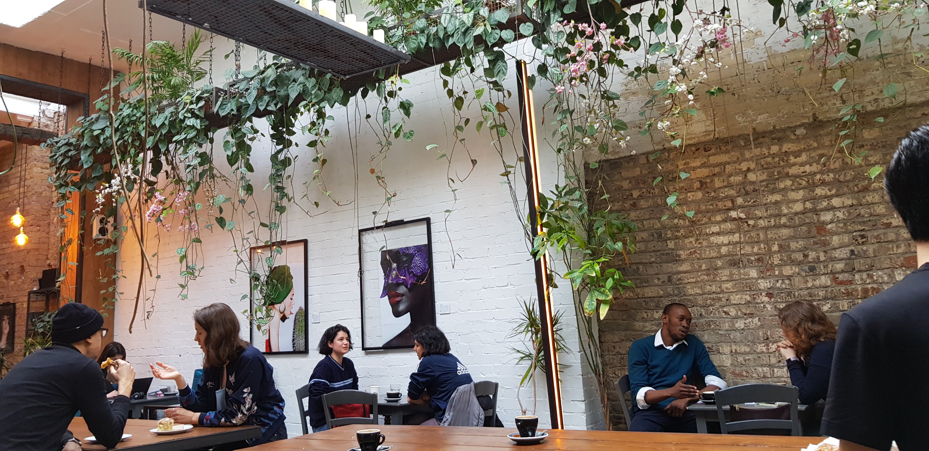 Coffee shop High-ceilinged coffeehouse with white brick & hanging greenery, plus cocktails & music at night.