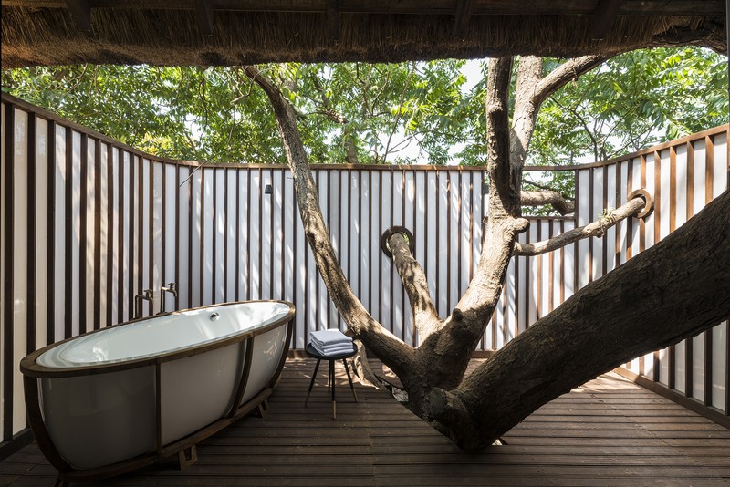 This lovely tree house in Tala, India, perches on the top of a hilltop property, surrounded by a forest and meandering river. The team at Architecture BRIO developed a wooden bridge that wraps around the house, allowing nature inside and around this new structure.