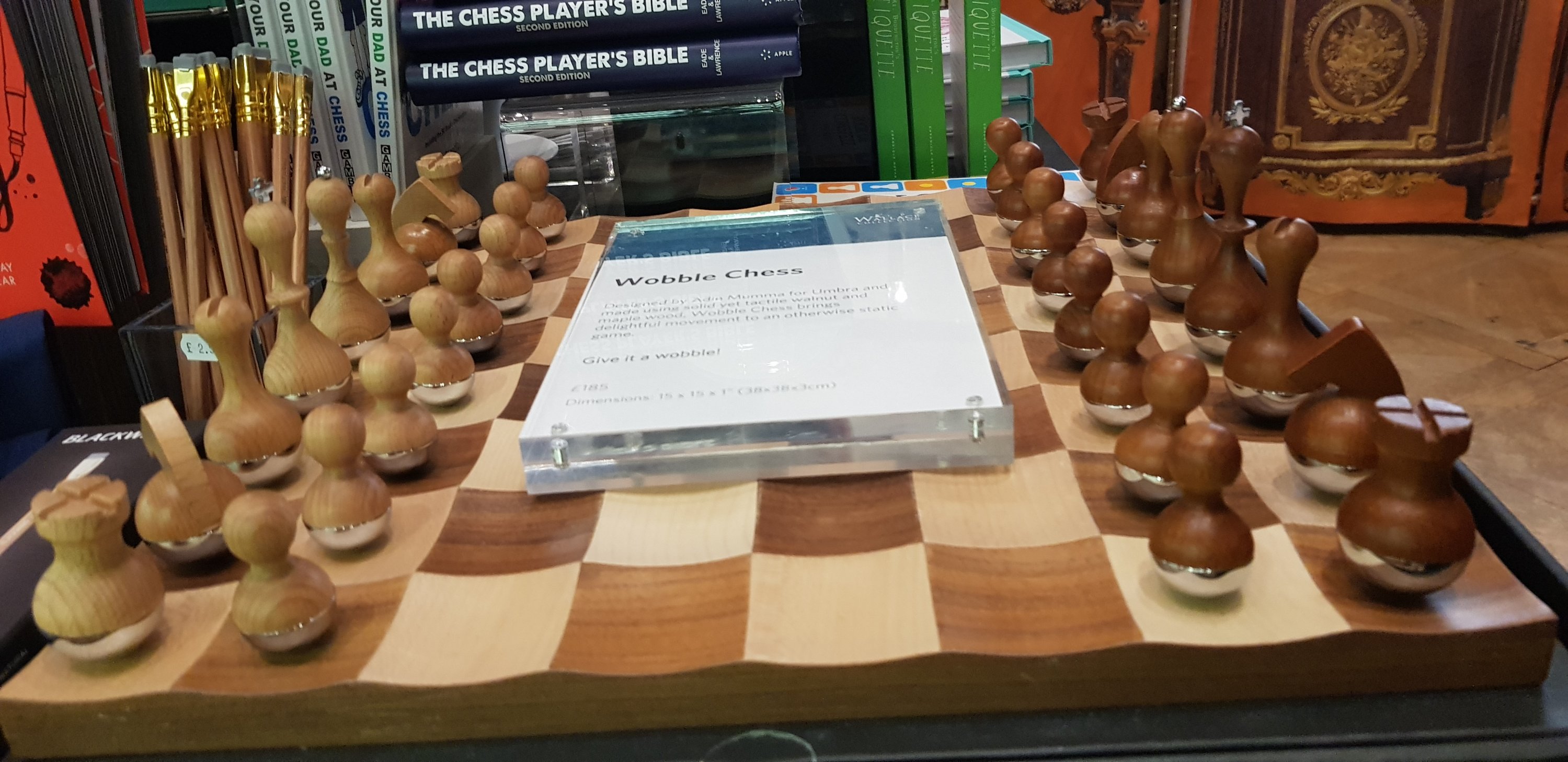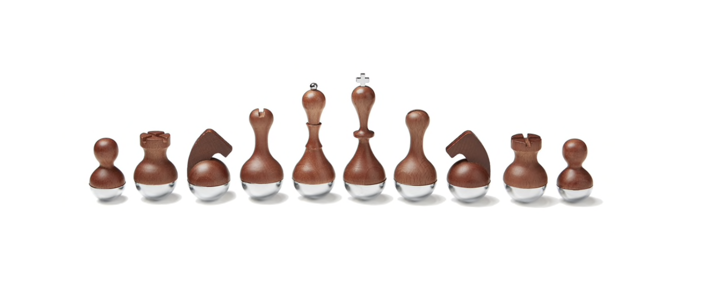 An award-winning design, the WOBBLE CHESS SET was made so that the chess pieces do not fall off the board while moving around. The concave landscape helps to stabilize the set, while the maple and walnut wood base makes for a beautiful decor piece.