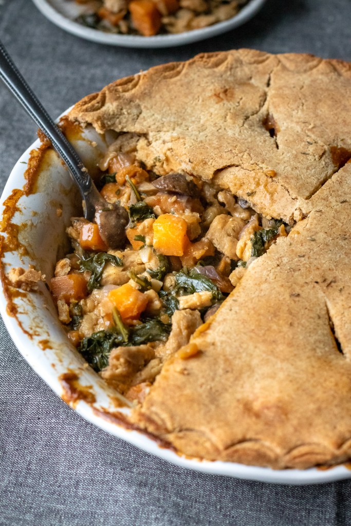 Wholesome and comforting vegan pot pie made with sweet potato, kale, onion, mushrooms, and soy curls. Oil-free and suitable for whole-food plant-based diets. *Use the rice flour option in the Healthy Vegan Pie Crust recipe to make it gluten-free.Equipment needed: rolling pin, large saute pan, 9.5-inch (1.5 Qt.) deep dish pie plate or similarly sized baking dishPrep Time 25 minsCook Time 50 minsTotal Time 1 hr 15 minsCourse: EntreeCuisine: AmericanKeyword: gluten free pot pie, healthy pot pie, oil free recipes, vegan pot pie Servings: 5 servings Calories: 467kcal Author: Lori Rasmussen