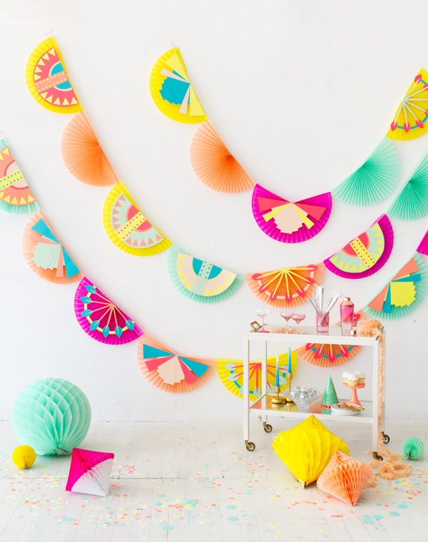 Materials: Paper bunting fan garlands (in peach, yellow, mint, and cerise), scissors, scotch tape, cardstock in a bunch of colours (we chose coral, pink, peach, neon yellow, mint, teal), glue stick, triangle hole punch, small round hole punch, ruler, x-acto knife