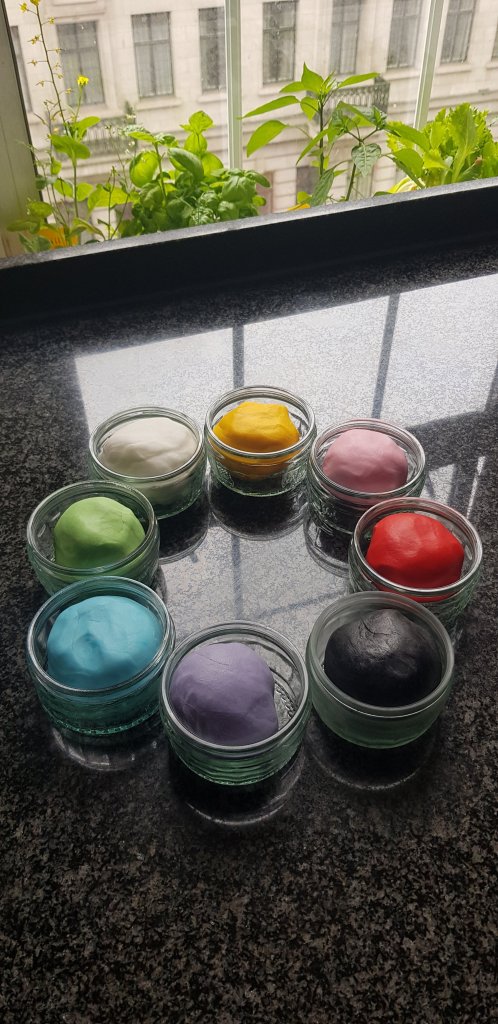 - kneed your food colouring into each ball, do as many colours as you would like.