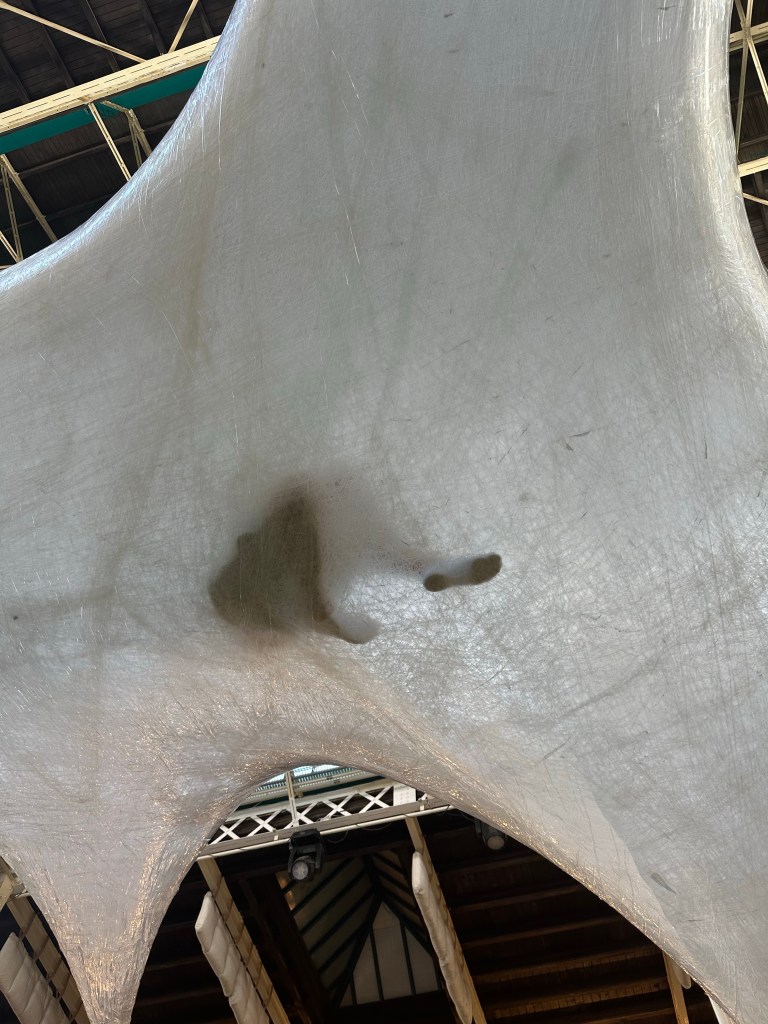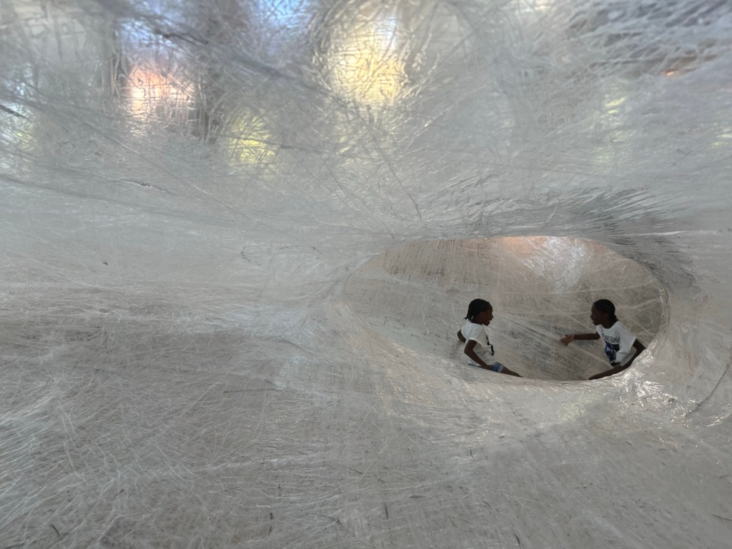 I quickly took off my shoes and joined the queue, I had to experience this for myself. Once inside I found myself surrounded by an intricate web of translucent tape, forming a mesmerizing labyrinth that seems to defy gravity.
