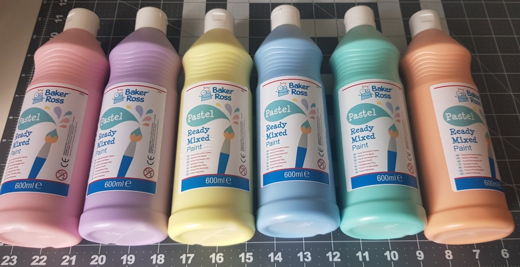 Select your choice of paint. I choses these Baker Ross Pastel Ready Mixed Paint for Kids. they are pastel colours good as a replica of the NW3 London postcode town houses.