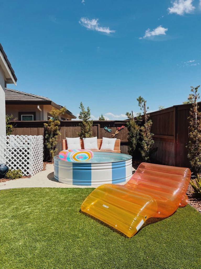 large metal stock tank tub filled with water in a backyard