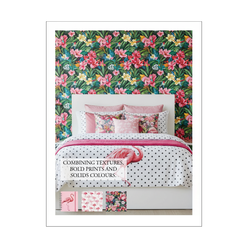 2. Layer Textures for Depth. Pair bold patterns with soft, solid colours. In our example room, the patterned wallpaper and flamingo-print duvet are balanced by gentle pink bedding and cushions. This mix adds comfort and interest without feeling too busy. Crisp white furniture helps ground all the color.