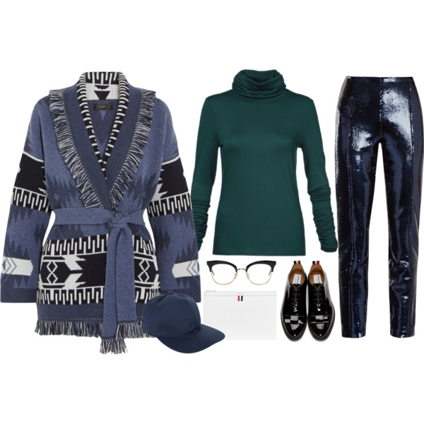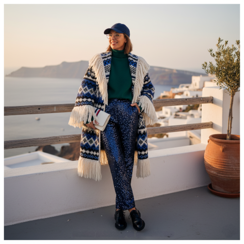 Underneath, I’ve layered a deep emerald green turtleneck for a pop of rich color that complements the cardigan’s earthy tones beautifully. And for that unexpected twist? Navy sequin trousers! They catch the light with every move and add a playful, glamorous edge to the cozy top half.