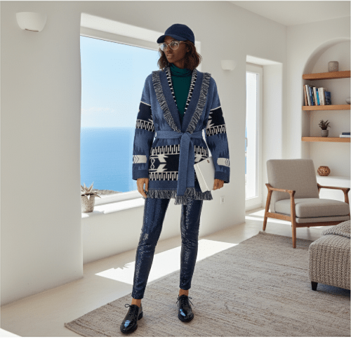 My absolute star player for this look is this incredible ALANUI cardigan. You know my love for a good statement knit, and this one delivers on every front. The intricate patterns, the luxurious fringe details, and that gorgeous blend of blues and creams just scream “chic autumn.” It’s like wearing a warm, stylish hug!