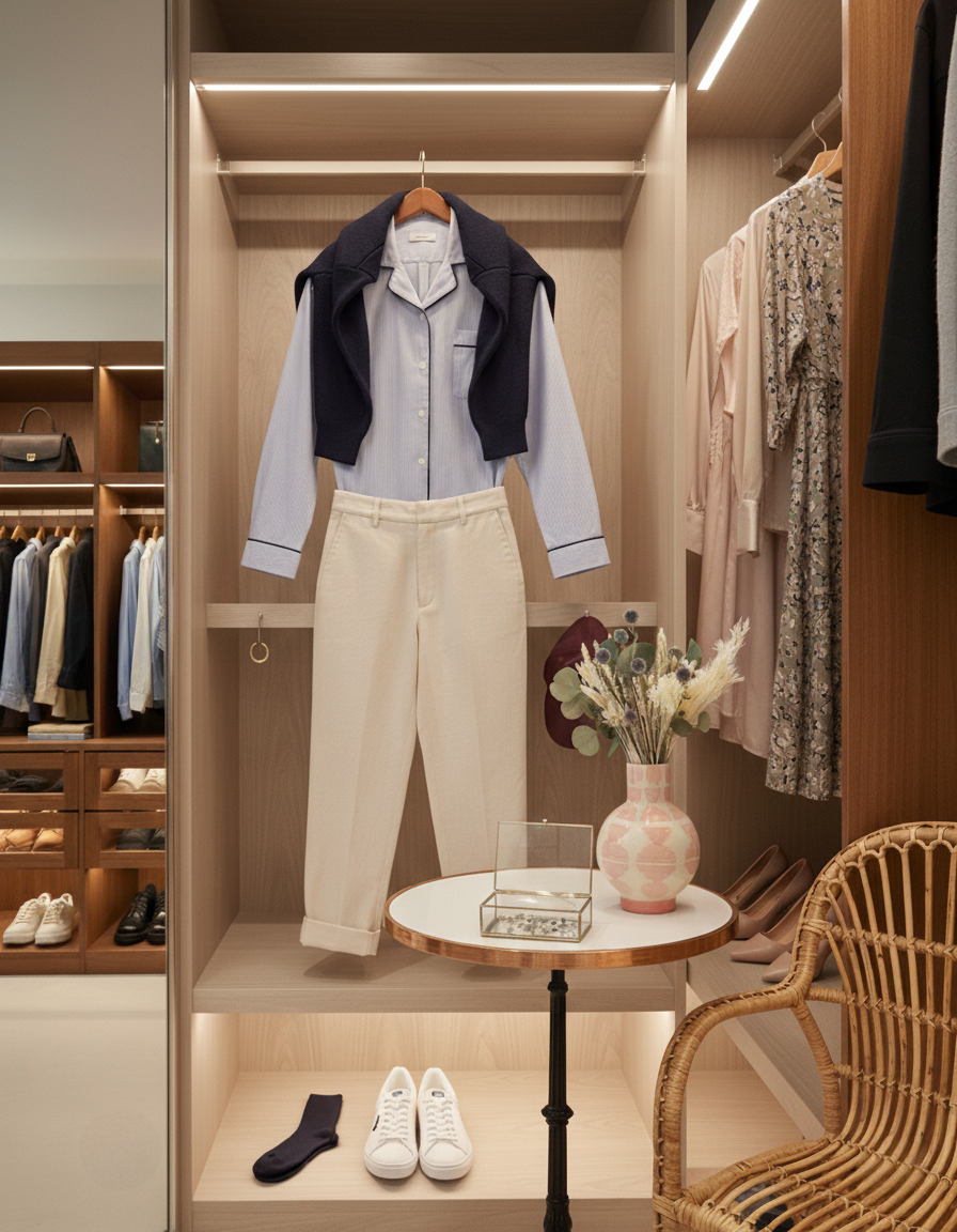 The Pinstripe Button-Down: Say goodbye to stuffy office shirts! This light blue pinstripe button-down, with its chic dark piping, brings a touch of tailored elegance without feeling formal. It’s airy, comfortable, and provides a crisp base for the whole look. I love how it instantly elevates even the simplest bottoms.