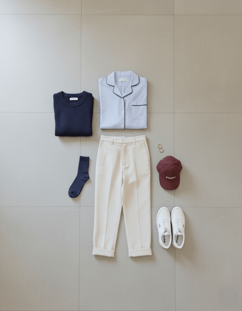 Subtle Accessories: A rich burgundy baseball cap adds a hint of playful sportiness, while delicate gold earrings and a simple gold ring provide just the right amount of sparkle without overpowering the minimalist aesthetic. A cozy navy sock ties the darker elements together.