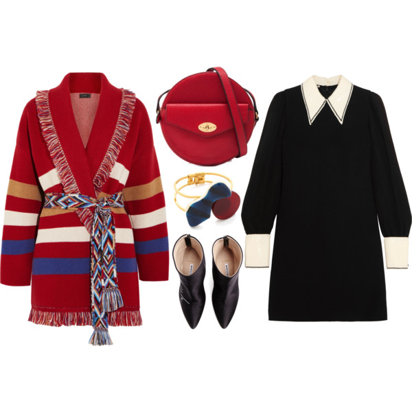 - The Bag We can’t get enough of the bold choice of a Red Circular Crossbody Bag. Its round shape is super modern and echoes the geometric style of the Mod dress, while the vibrant red injects a lively splash of colour that pairs perfectly with the cardigan’s stripes.