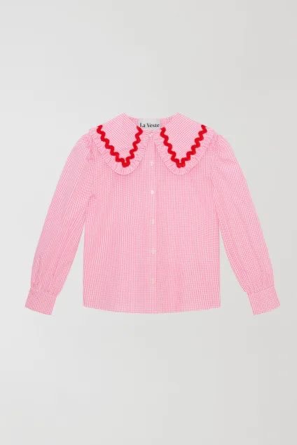 The Oversized Collar: A huge trend right now that adds a touch of vintage charm.The Ric-Rac Detail: That red wavy trim provides a sharp contrast against the soft pink gingham, giving it a modern, “cool-girl” edge.