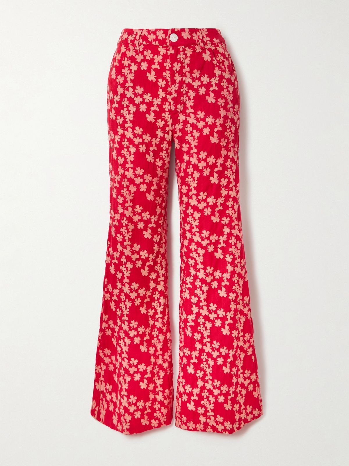 Instead of the classic vertical stripes seen in the archival photos, I’ve opted for these red floral wide-leg trousers.