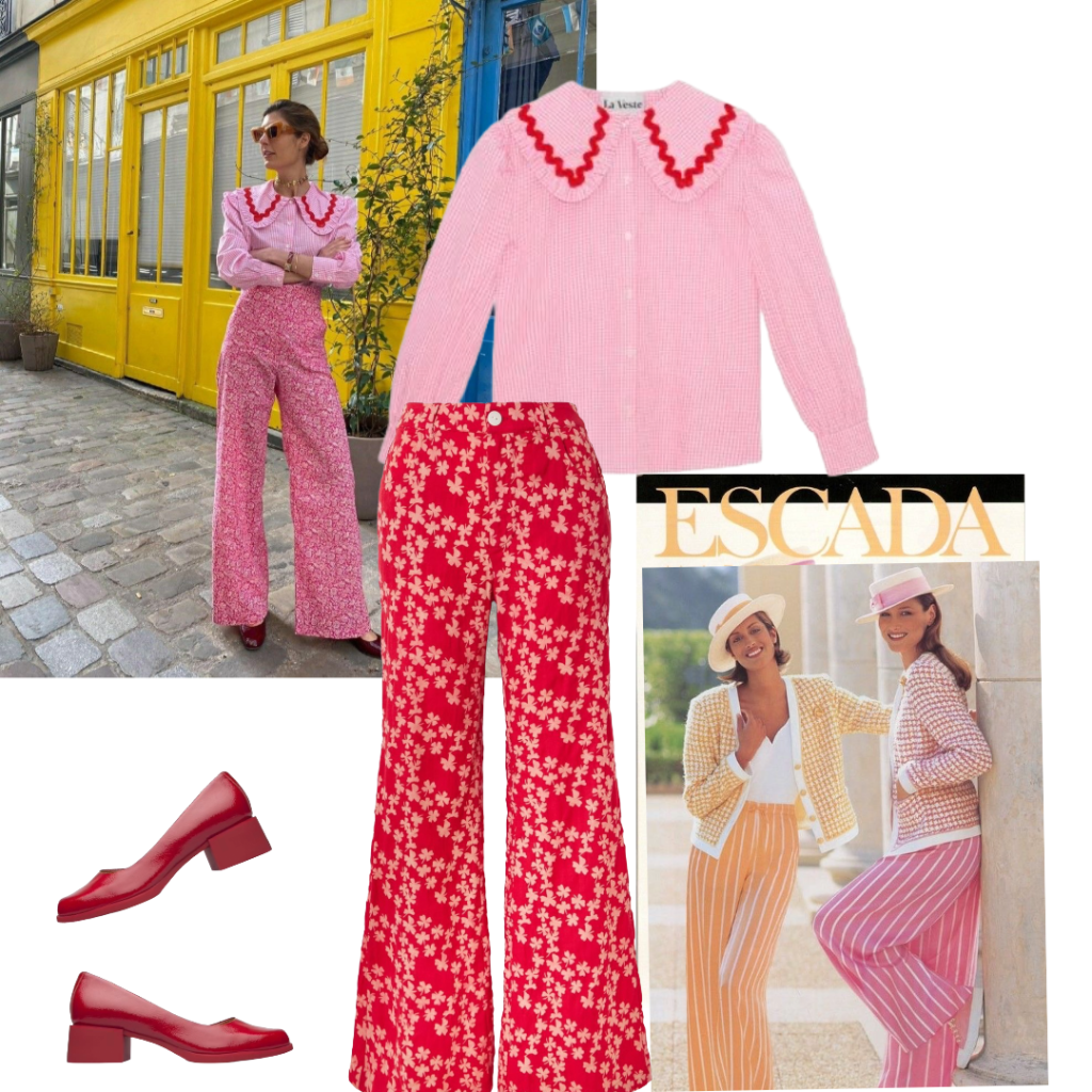 Texture & Pattern: Mixing gingham with a floral print might seem daring, but because the colours (red and pink) are in the same family, it looks intentional rather than chaotic.The Silhouette: Keeping the high-waisted, wide-leg cut maintains that sophisticated Escada silhouette while feeling much more relaxed for a day out.