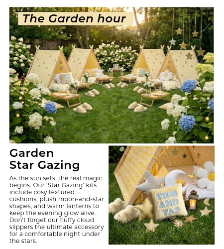 - The Details: Add plush moon-and-star cushions and lanterns to keep the “evening glow” alive as the sun goes down.