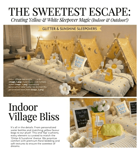 A sleepover isn’t just for kids it’s about creating a space to “yap,” laugh, and recharge. Whether you’re under the stars or under the ceiling fan, the yellow theme brings a sense of joy that’s impossible to ignore.